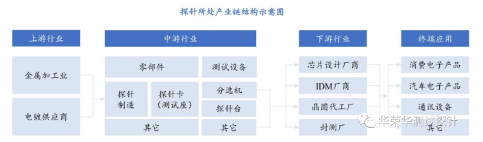 探針作為半導(dǎo)體產(chǎn)品測(cè)試的關(guān)鍵部件,處于半導(dǎo)體產(chǎn)業(yè)鏈中游的測(cè)試設(shè)備及其零部件制造行業(yè),探針行業(yè)的上游為金屬加工,電鍍行業(yè),下游為芯片設(shè)計(jì)、晶圓制造及晶圓代工、封裝與測(cè)試行業(yè),經(jīng)測(cè)試達(dá)到設(shè)計(jì)規(guī)范要求的半導(dǎo)體產(chǎn)品最終應(yīng)用與消費(fèi)電子、汽車電子、通訊設(shè)備等眾多領(lǐng)域。