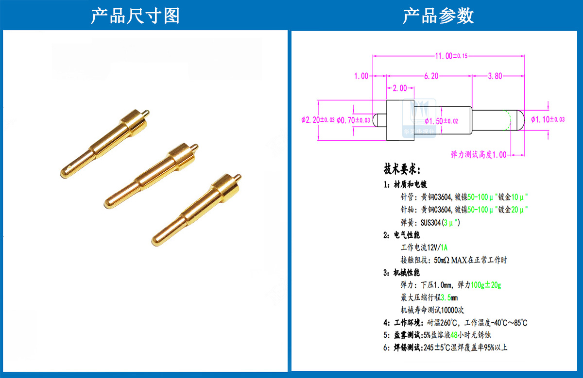 產品頭型:探針外徑為1.5mm,總長度為11mm、針的兩端的頭型為圓頭
