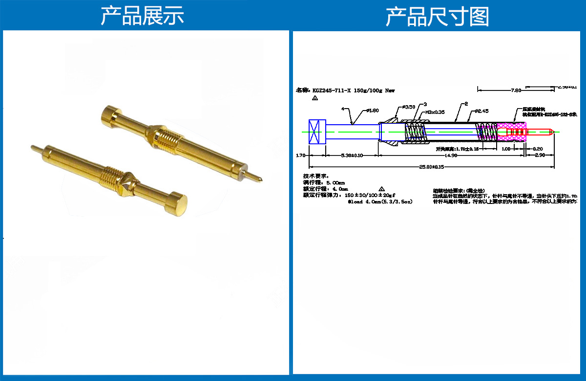 產(chǎn)品介紹:本產(chǎn)品一般用有定向作用的結(jié)束測試用,產(chǎn)品選用日本SK4 彈簧選用的是琴鋼線。工廠選用的材質(zhì)都是比較硬的,有利于在測試的時候過大電流不會容易損壞。